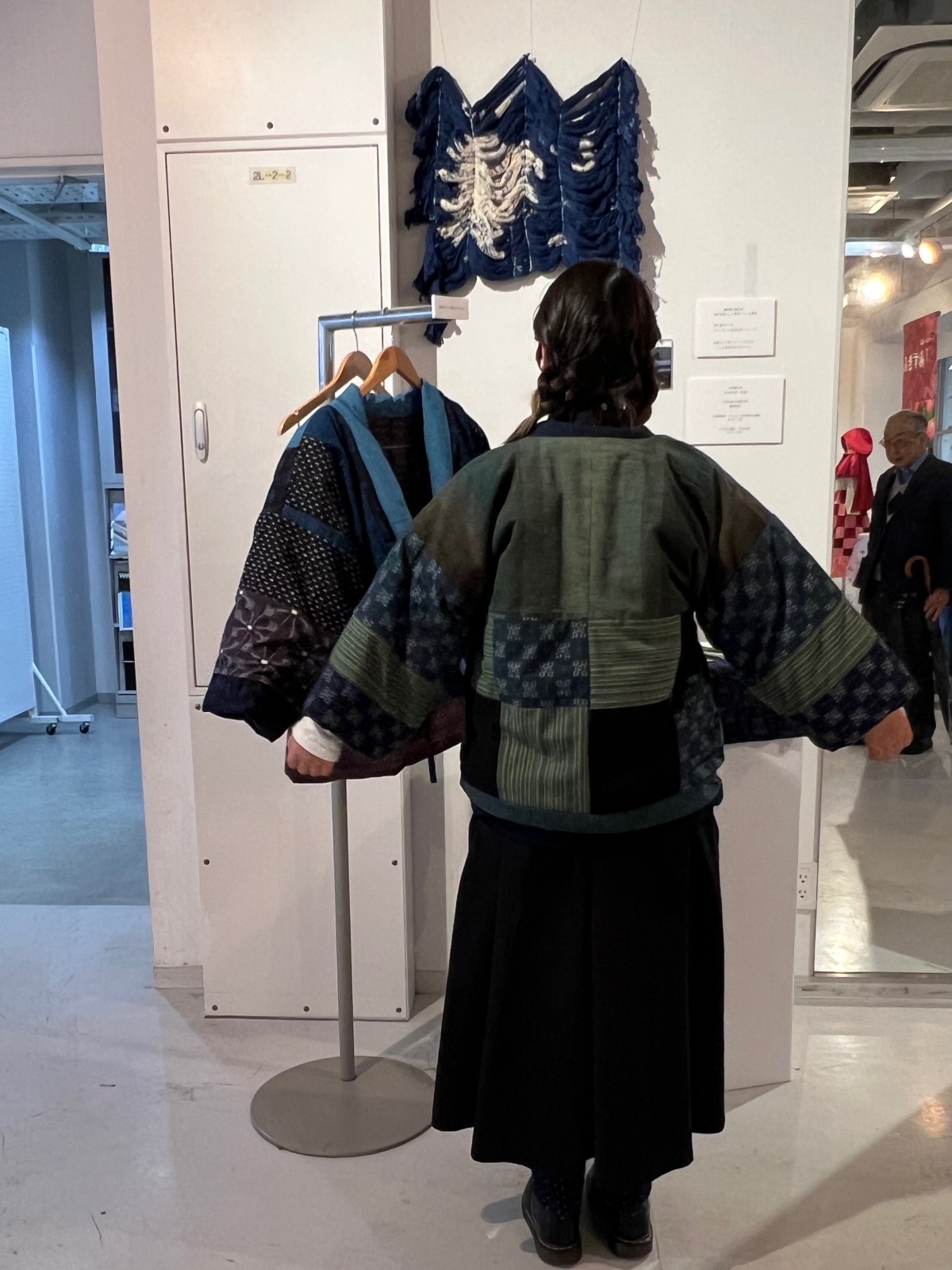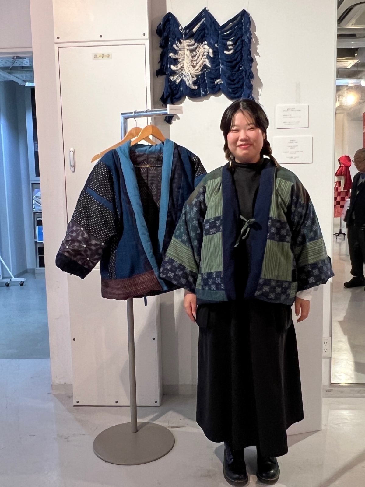 女子美祭 2025年10月30日 久留米絣に興味をもっている学生さんからハギレを見せてほしいと連絡があり会社に来てもらいました。袢纏を作成するとの事で会社に来てもらったのが9月24日、学祭が10月末と聞いて井芹さんと私は『のんびりハギレを見ている場合ではないじゃない。間に合わないわよ!頑張って!』と初対面なのに老婆心ならが葉っぱをかけました。先週末女子美祭に伺って袢纏を見てきました。今どきの若者向きの可愛らしいデザインで藍木野のハギレ達がセンス良く並びふわふわと軽くて暖かでした。学生さんたちに久留米絣の良さが受け継がれていくといいなぁ~。杉本 次» 藍木野の暮らし