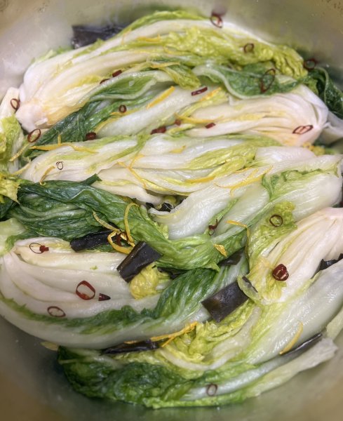 白菜の漬物 2026年01月13日 年末は、お節料理をいろいろ作ってみました。 昆布巻きは、今までで一番おいしくできました。 濃い味が多いから、箸休めになりそうなものを、、と思っていたら おおきなおおきな白菜が150円で売っていたので 白菜のお漬物を作ってみることに。 1月というのに日中はぽかぽか陽気の鹿児島。 半日、白菜を干していたらいい具合にしんなりと。 きっちりと重さをはかって塩をすりこんで、、 おいしいお漬物ができました。 また安く白菜が手に入ったら作ろうと思います。 聡子・鹿児島より «前 次» 藍木野の暮らし