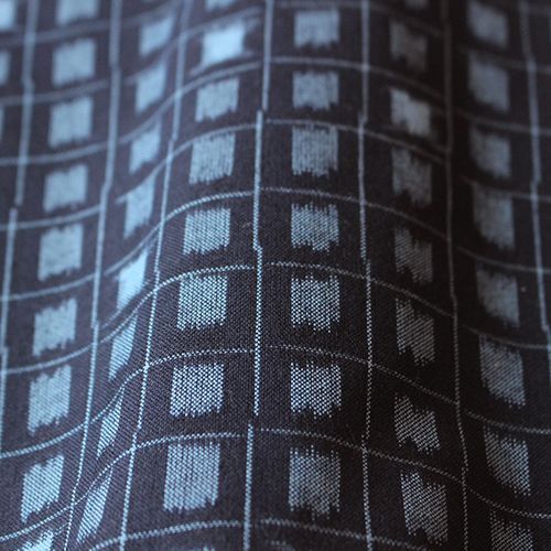 紺地にブルーの格子柄の中に四角い模様が並んでいます。