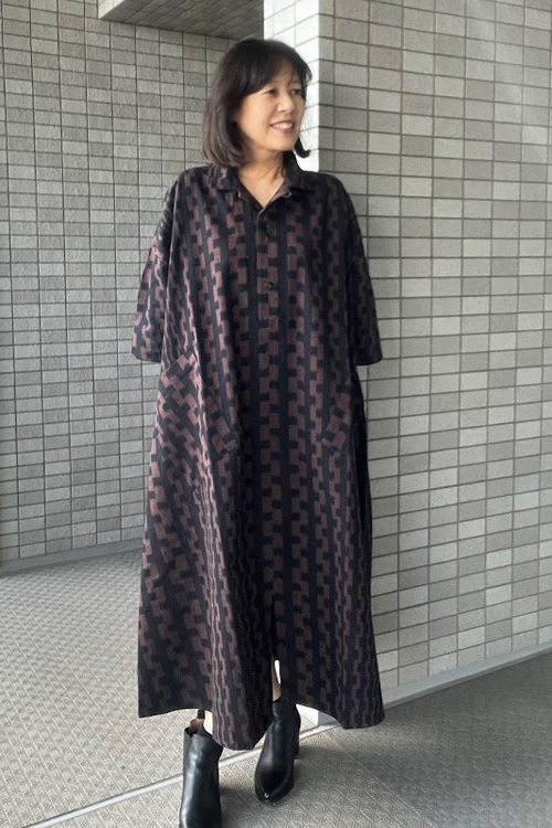 茶と黒の市松柄をアレンジした、モダンな雰囲気の ビッグワンピース。
