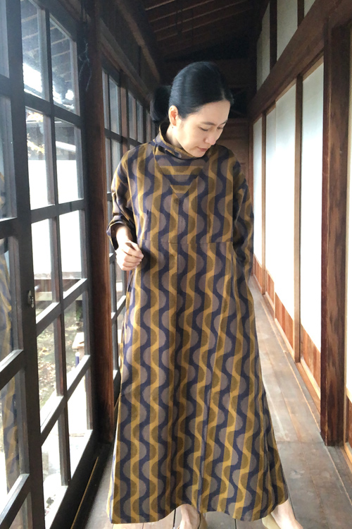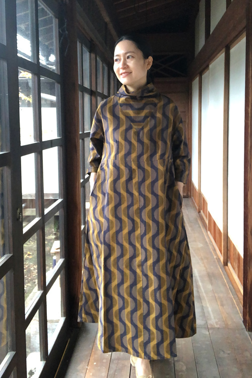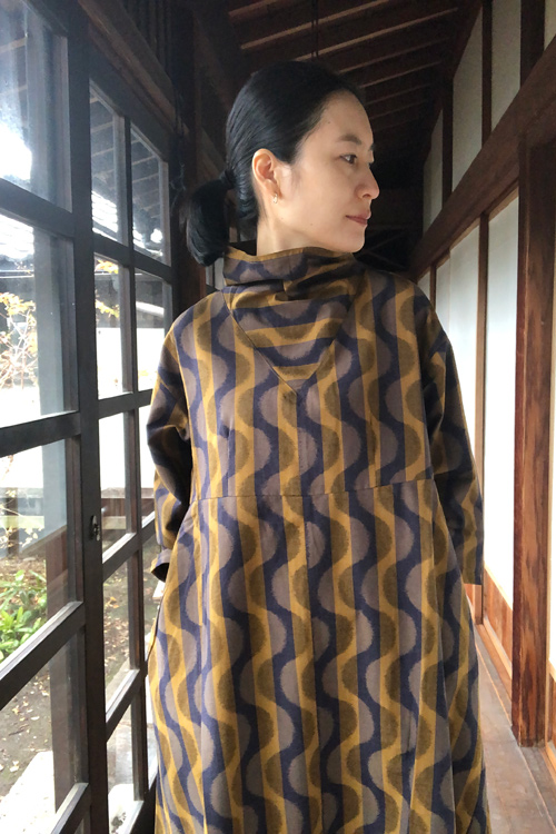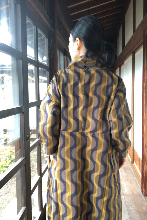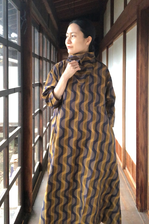 立ち襟ワンピース(よろけ縞黄色)