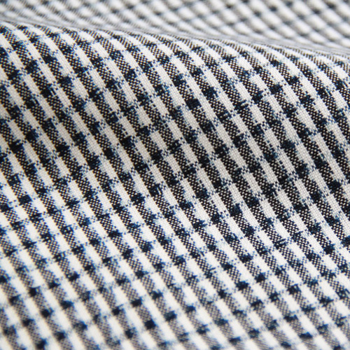 白地に黒と藍の糸で細やかな格子柄を表現。
