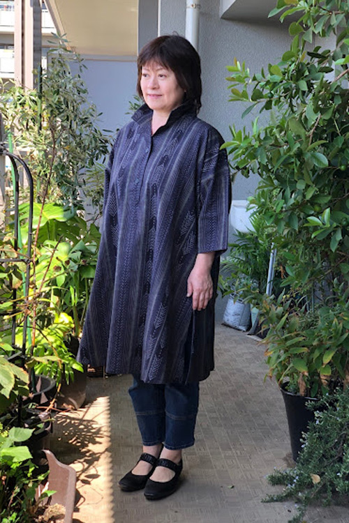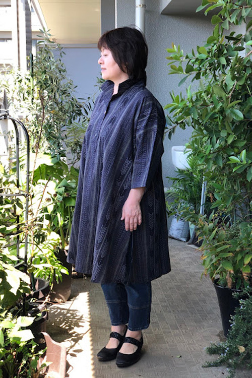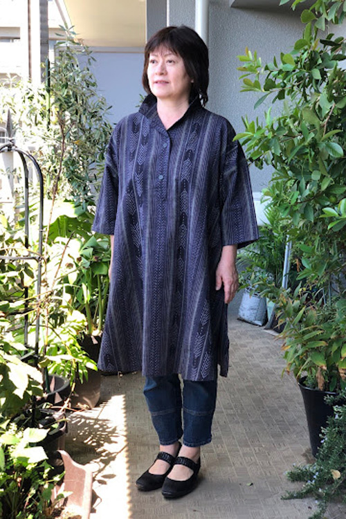 襟元は開襟にしたり、ボタンを閉めて立ち襟にしたりとアレンジできます。