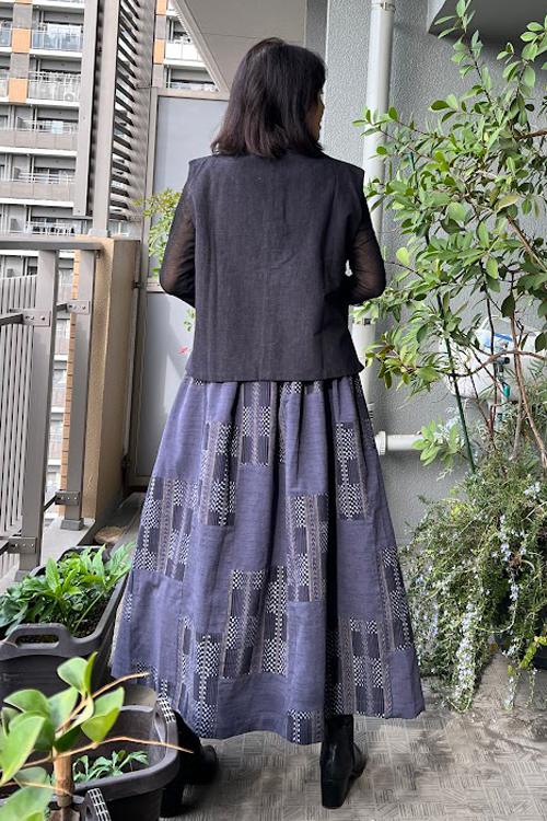 紫がかった灰色とレンガ道灰色の反物をたっぷりと使った贅沢なスカート。柄の出方に気を使ったと縫製職人さん。裏のつなぎも丁寧に、端にロックをかけステッチをしています。