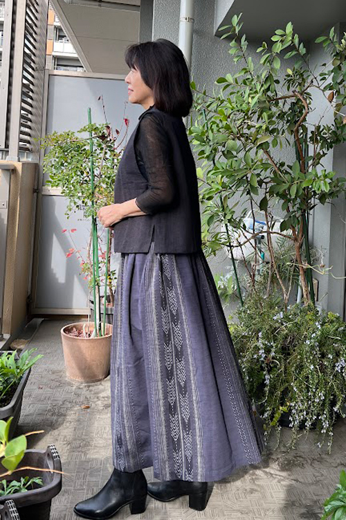 紫がかった灰色と高級矢羽根の反物をたっぷりと使った贅沢なスカート。柄の出方が非対称なので心配しましたが動くとすっきりとしたデザインでとても素敵になりました。裏のつなぎも丁寧に、端にロックをかけステッチをしています。