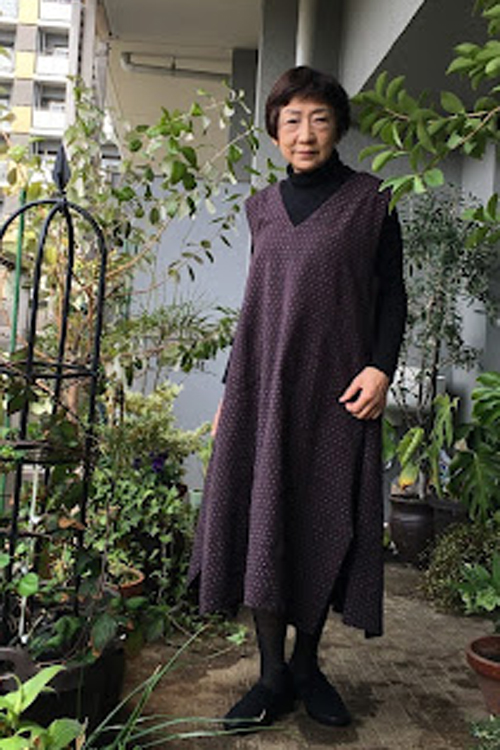 Vネックにフレアーシルエットのジャンパースカートを久しぶりに作りました。