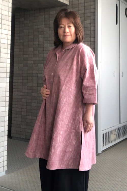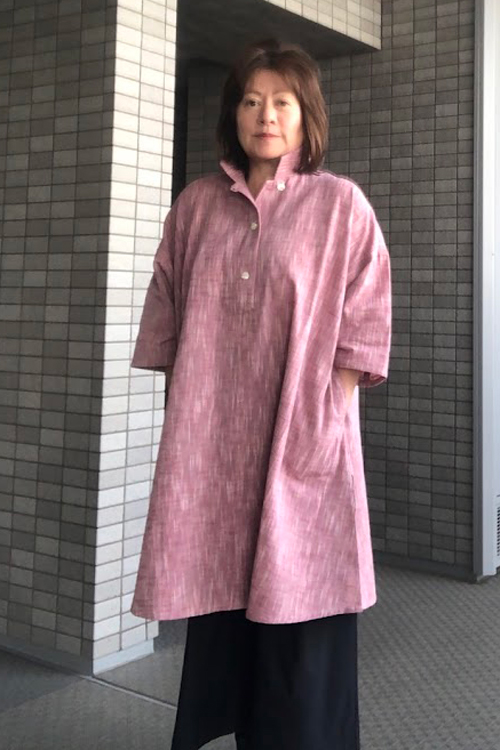 襟元は開襟にしたり、ボタンを閉めて立ち襟にしたりとアレンジできます。