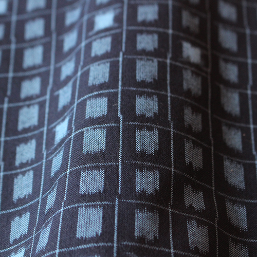 深い青色にあざやかな青色の四角を配した柄。所々薄い青色の四角模様になっています。