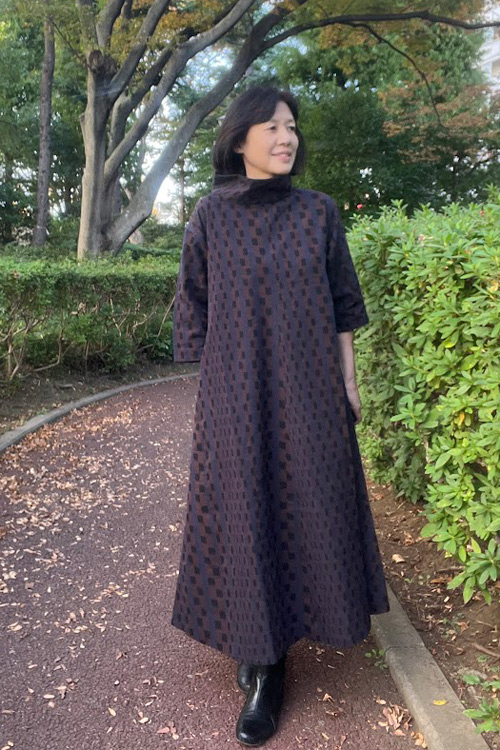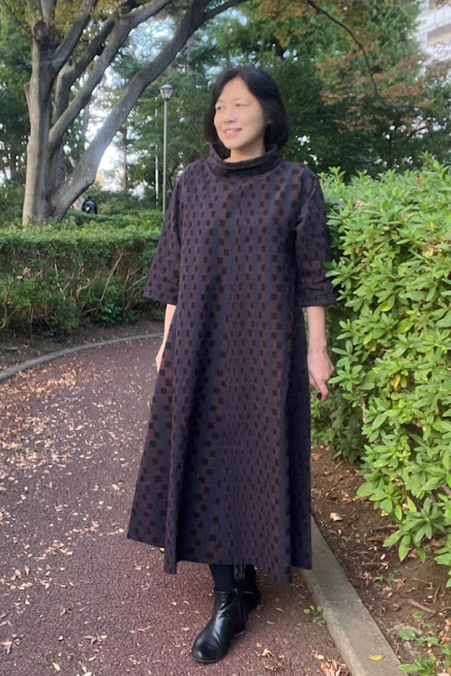 「味のある色味の変わり市松柄 シルエットがきれいなロールカラーワンピース」