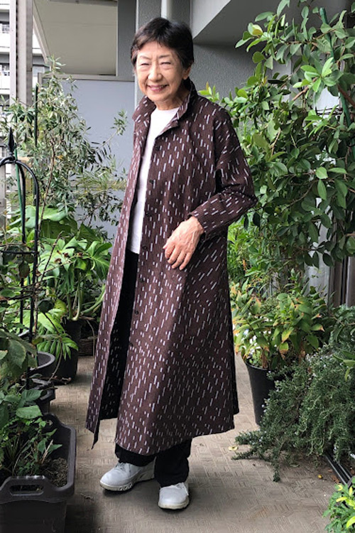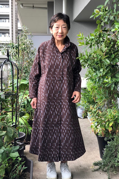 久留米絣の伝統的ながら「矢羽柄」をアレンジしシックなコートドレス。