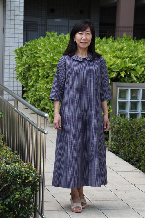 小さめのフラットカラーが清楚な印象です。 久留米絣のサラリとした風合いが肌に馴染みます。