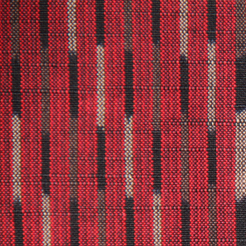 赤、濃紺、茶色の糸を組み合わせ、落ち着いた色合いに織りあげました。