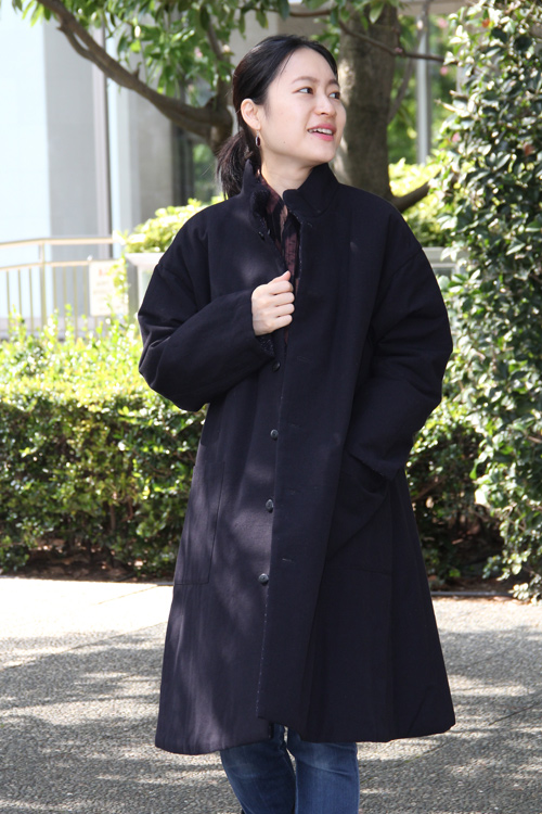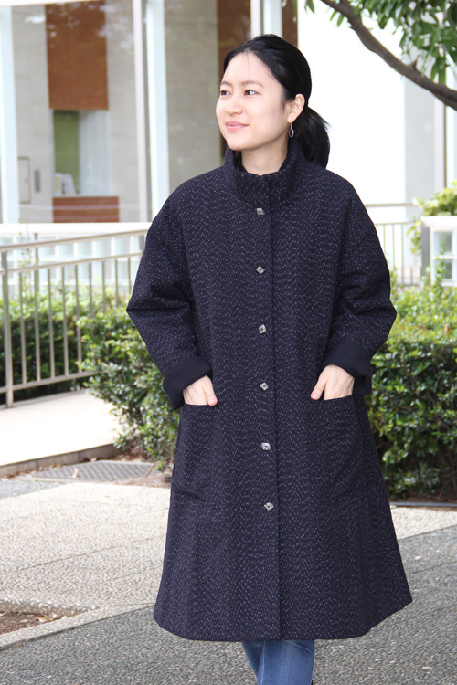ゆるやかなAラインのシルエットと立ち襟ですっきりとしたデザインです。