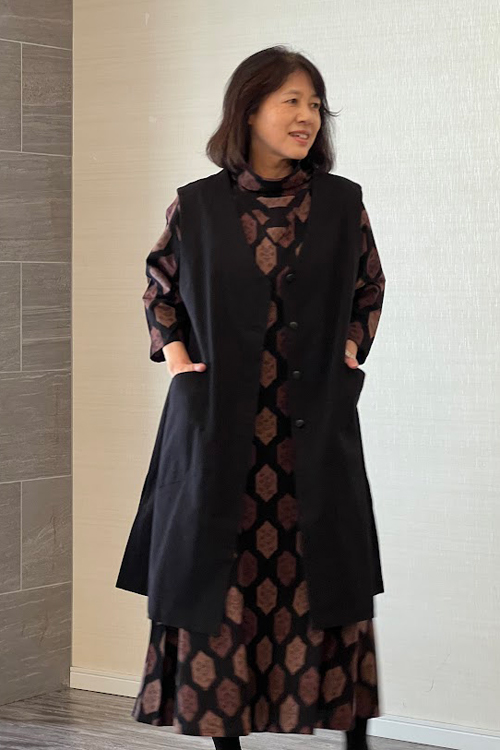 スッキリしたVネックの前開きタイプで裾に向かって緩やかに広がるAラインがおしゃれです。