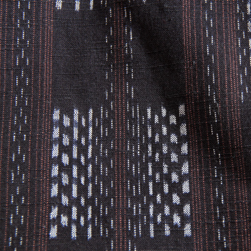 黒地に白絣と赤茶のストライプが入ったレンガ道をイメージした反物。