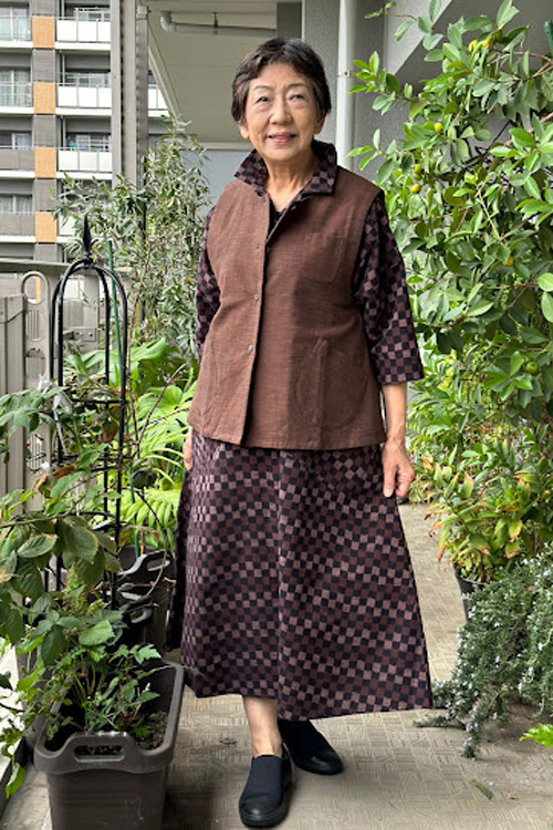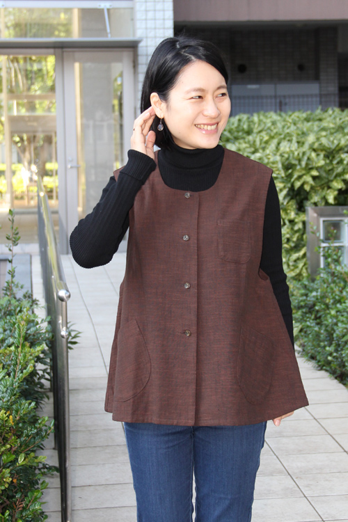 手で紡いだような節のある優しい糸で織りあげた白樺の反物で ベストを作りました。