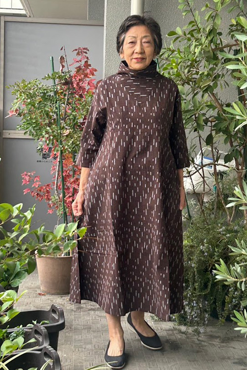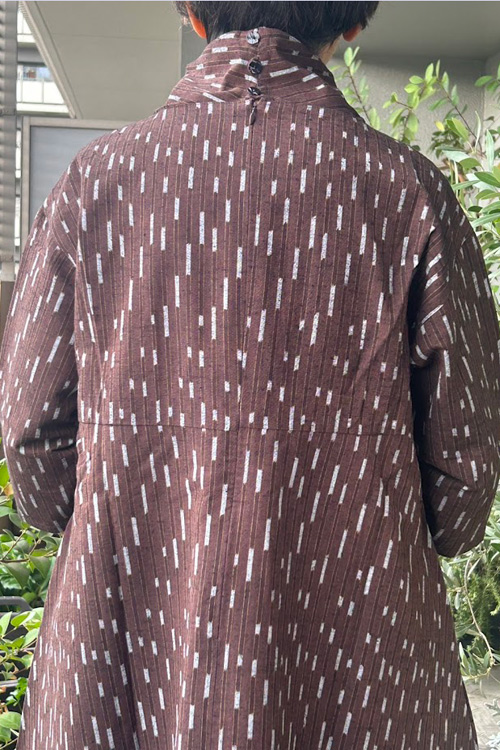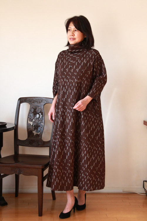 立ち襟ワンピース(茶矢羽根くるみ色)