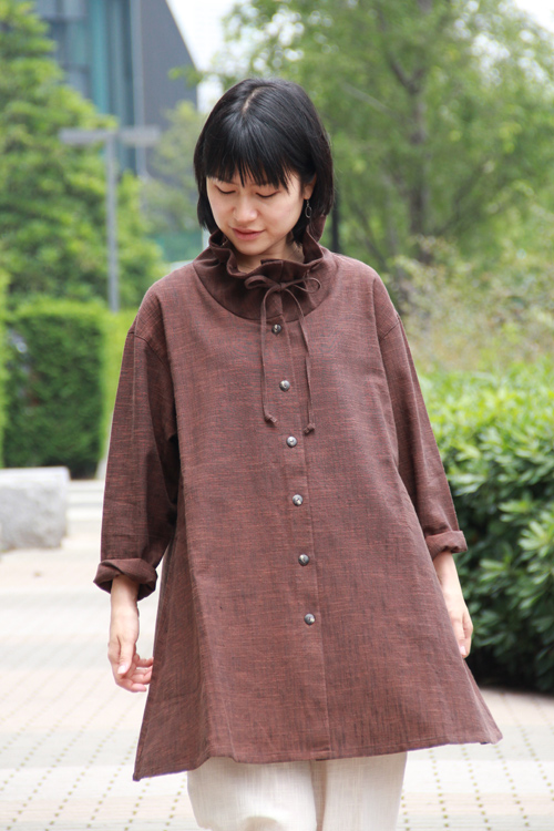 リボンをしぼり、フリル風の襟元にしても、前を開けてジャケット風に着てもよく お出かけにも重宝しそう。